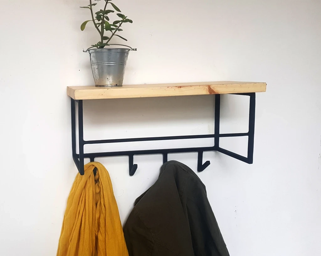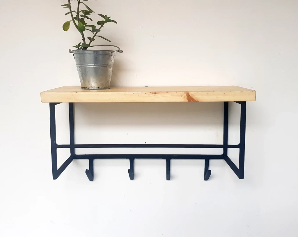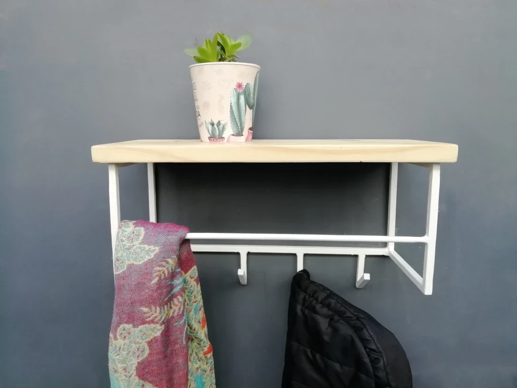 Realizado con hierro macizo cuadrado de 10 mm con madera de pino protegida con Cetol incoloro. (consultá por otras maderas o tintes)